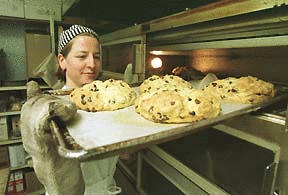 Heidi Umphenour pulls a fresh tray of Irish soda bread from the oven at Blackbird Bakery Tuesday morning. The bakery usually sells out of the bread by noon.