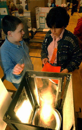 Sakai sixth-grader Jesse Rees (left) explains the workings of his miniature tornado to judge Alison Craig at Thursday’s Science Fair.