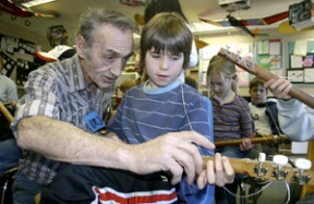 This past week, he began teaching the third-graders in Richard Pearsall’s class at Wilkes Elementary how to play a three-stringed “strum stick†that the class had a hand in crafting.