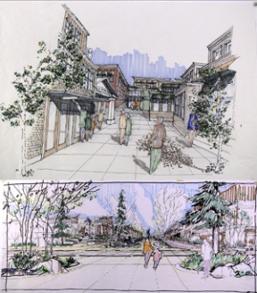 Brachvogel points to a charrette design illustration that shows a new winding pedestrian path along a proposed road on Town & Country Market’s west side. The proposed path would replace T&C’s present parking lot and move parking underground. The additional road and wide sidewalk would serve as one of many new veins connecting the main travel arteries of Winslow Way with the Eagle Harbor.