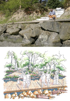 Plans for Waterfront Park improvements include terraced platforms aimed at protecting tree roots and over-water boardwalks to draw beach strollers off the park’s narrow stretch of shore.