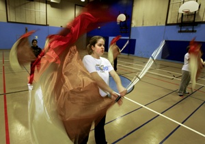 That includes learning to toss and manipulate the not-insubstantial tools and also to master dance basics and body movement, all while conveying the intended mood with bronze- and crimson-hued costumes and flags.