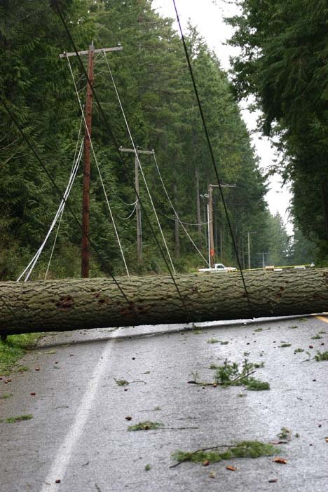 Power to Bainbridge was lost when a tree fell on a transmission line on Miller Bay Road in Suquamish, and a second transmission line was knocked out by a falling branch in an unknown location on the island.