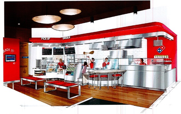 The island Domino’s would make an effort to include dining at its location, in addition to its usual delivery service. As such, the interior would be styled to reflect the feel of a traditional, sit-down restaurant.