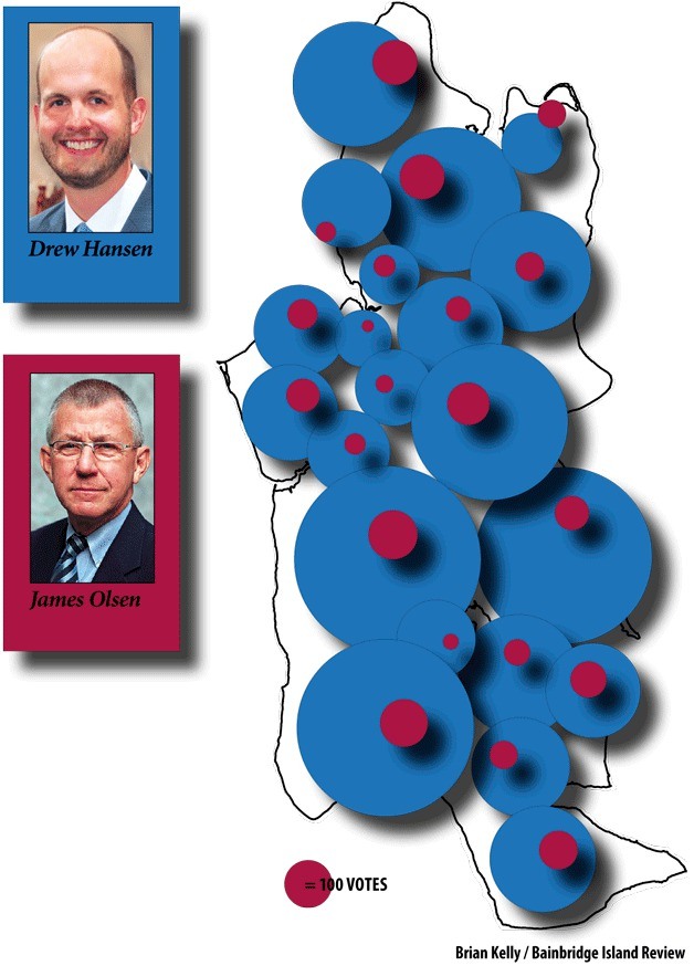 Although Hansen, the Democratic incumbent, and James Olsen, the Republican challenger, both claim the island as home, an analysis of precinct returns by the Review in the Aug. 7 election show Hansen was the overwhelming choice of Bainbridge voters.
