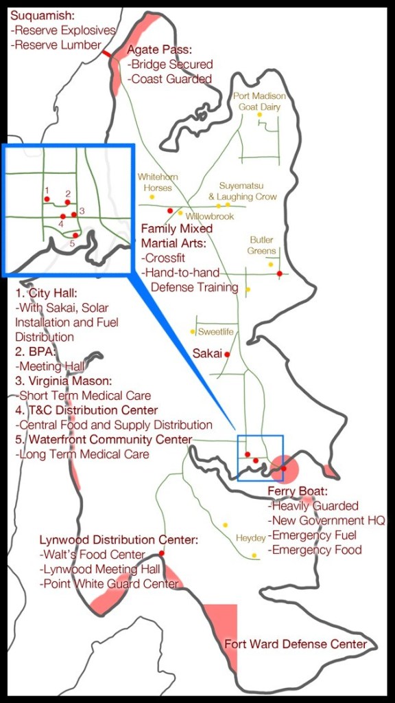 The island is also lucky that farming is already firmly established. The many Bainbridge farms will be among the most important resources to provide food. The fish farm at Fort Ward will also come in handy.