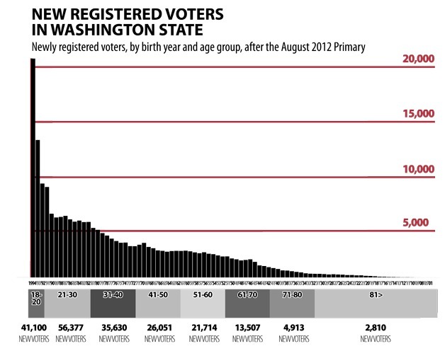 Nearly half of the voters in Washington who registered or reregistered to vote after the August 2012 Primary are 30 years old or younger, according to an analysis of newly registered voters by the Bainbridge Island Review.