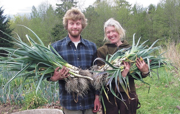 Farmers Jared Trilling and Rebecca Slattery harvest leeks for Persephone Farm.