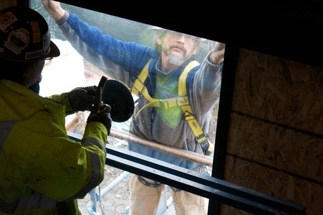 Eyes were locked and pictures were taken as the first pane of glass was installed in the “Beacon” at the Bainbridge Island Museum of Art.