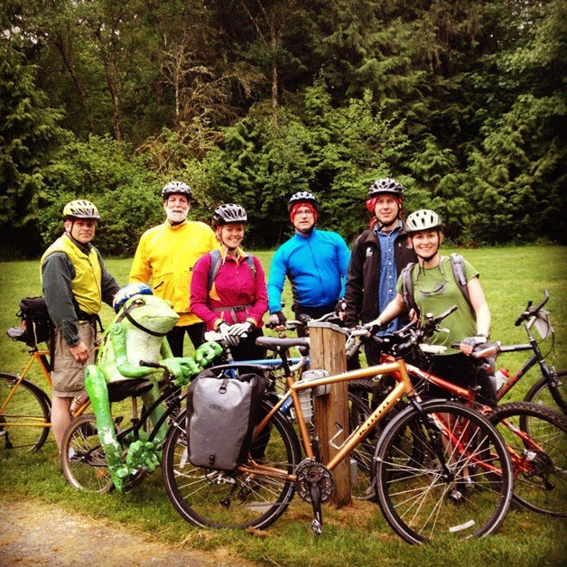 Ray Cramer, a senior faculty member, says they have been getting a group of grad students and staff together since he started at the school eight and a half years ago. This year one of the staff members made everyone green helmet covers that look like frogs to represent IslandWood’s unofficial treefrog mascot, Waq Waq. They’ll also be pulling a larger version of Waq Waq—the size of a small child—on a trailer bike.