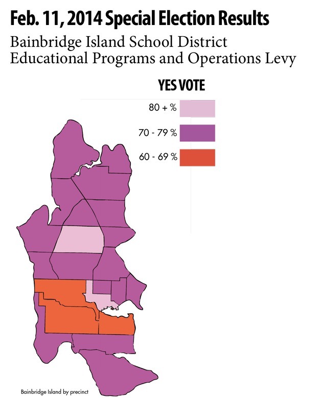 An analysis of unofficial precinct returns in the Feb. 11 Special Election by the Bainbridge Review shows that eight-in-10 voters in the precincts of Winslow and Crystal Springs voted “yes” for Proposition 1, the Bainbridge Island School District’s Educational Programs and Operations Levy.