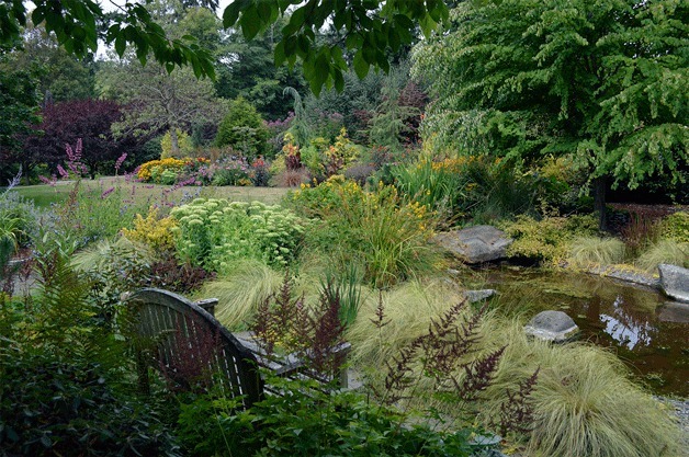 Weissman Garden, Bainbridge Island (directions will be provided at other locations); surrounded by firs and cedars, and including a collection of specimen trees, a border of hydrangeas, a fern and native plants garden, and water features.
