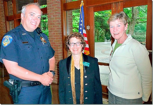 Washington State Supreme Court Justice Sheryl Gordon McCloud, center, stands with with Bainbridge Island Chief of Police Matt Hamner and Helene Schmitz following the justice’s recent presentation to the Bainbridge Island Kiwanis Club.
