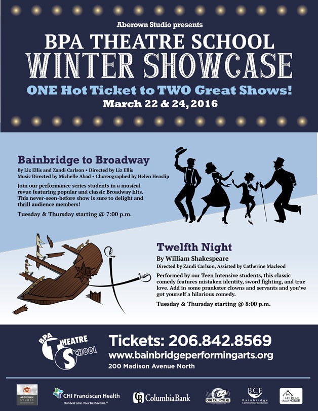 The family-friendly event features talented students in the second through 12th grades. The show opens at 7 p.m. with “Bainbridge to Broadway ‘16”, by Liz Ellis and Zandi Carlson, and follows, at 8 p.m., with Shakespeare’s classic comedy “Twelfth Night”