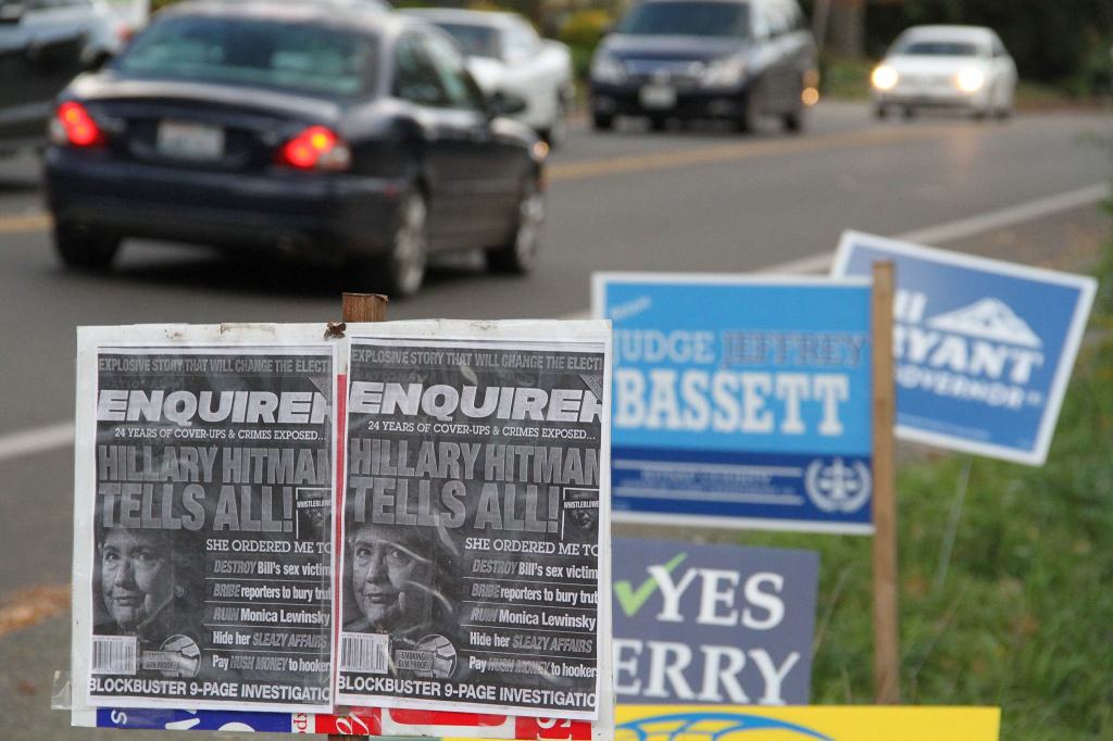 The strange signs have apparently been put up by a supporter of Republican candidate Donald Trump; The National Enquirer has endorsed Trump for president.