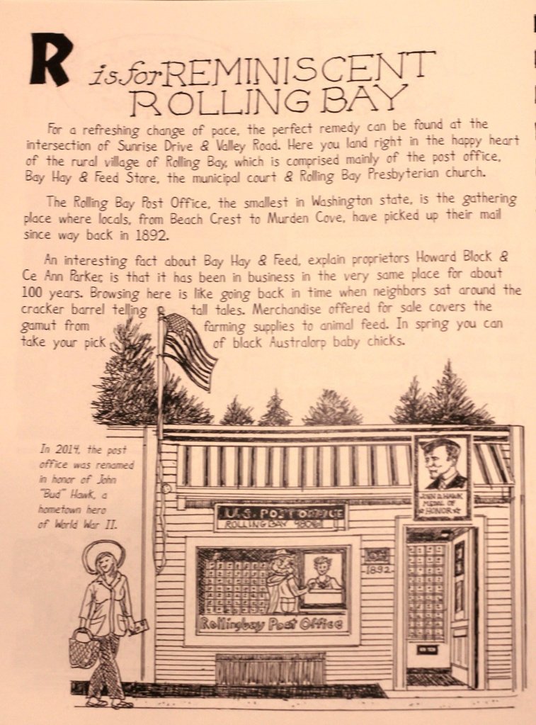 “I was walking in the old Paper Products store,” he remembered. “I was looking at a rack filled with coloring books and all of a sudden I saw an A, B, C coloring book and I thought, ‘Hey, why not do an A, B, C book of Bainbridge Island?’”