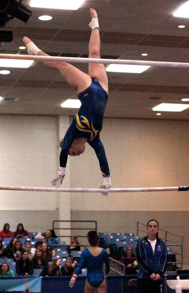 Remi Rosencrans advanced through Day One’s individual events to compete again in vault and bars Friday, but a nagging ankle injury earned the day before promptly whittled her scope further and forced her to scratch in the first event. On the bars she finished in sixth place overall, tied with Sehome’s Jordyn Correll, with a score of 9.275.