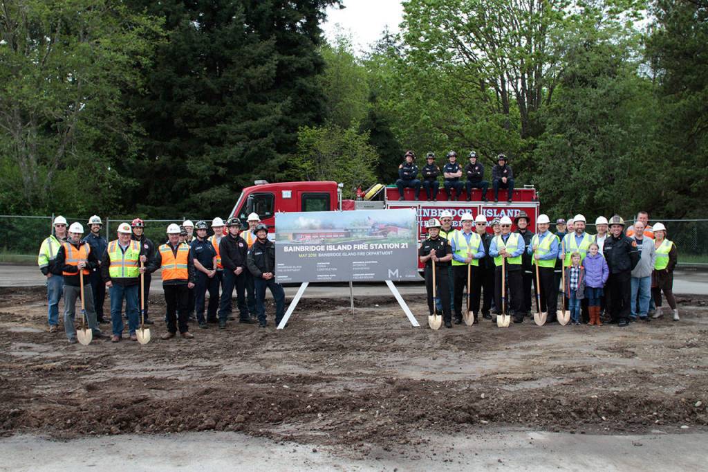 Members of the Bainbridge Island fire Department, FORMA Construction and Mackenzie architecture firm gather for the groundbreaking ceremony, marking the official start of construction of the new and improved Station 21 on Madison Avenue.