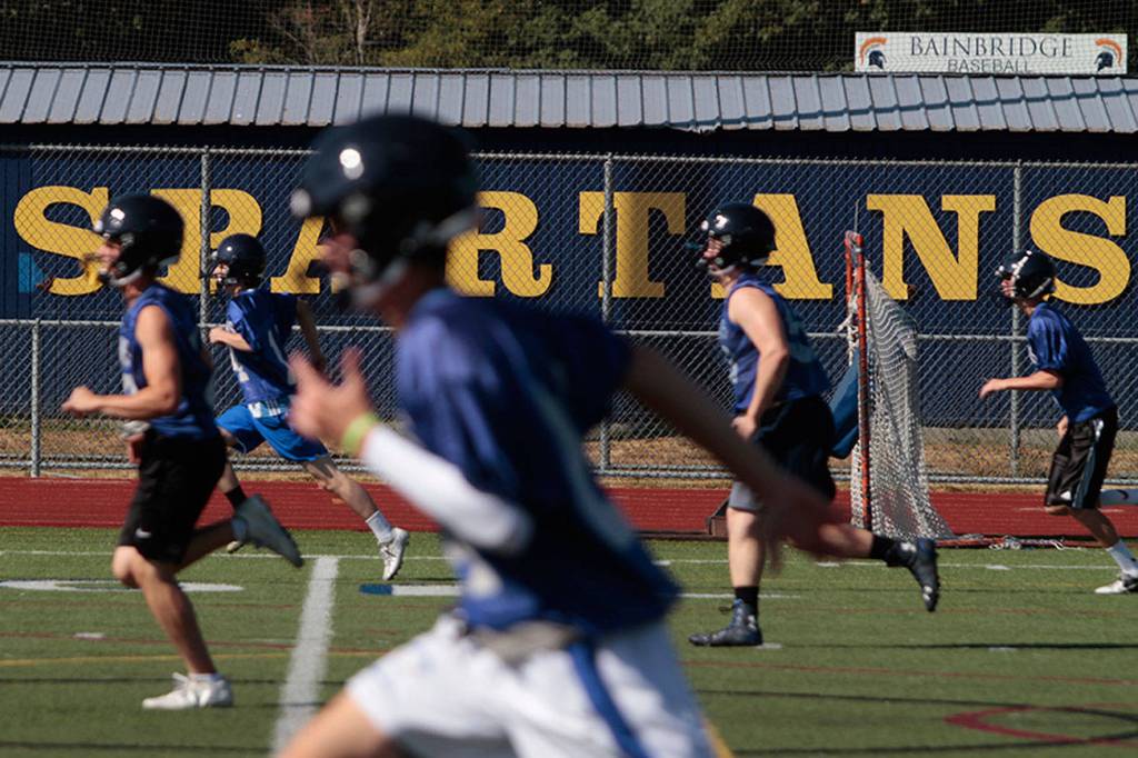 Luciano Marano | Bainbridge Island Review - The Bainbridge High School varsity football team works through sprint drills during a recent practice session.