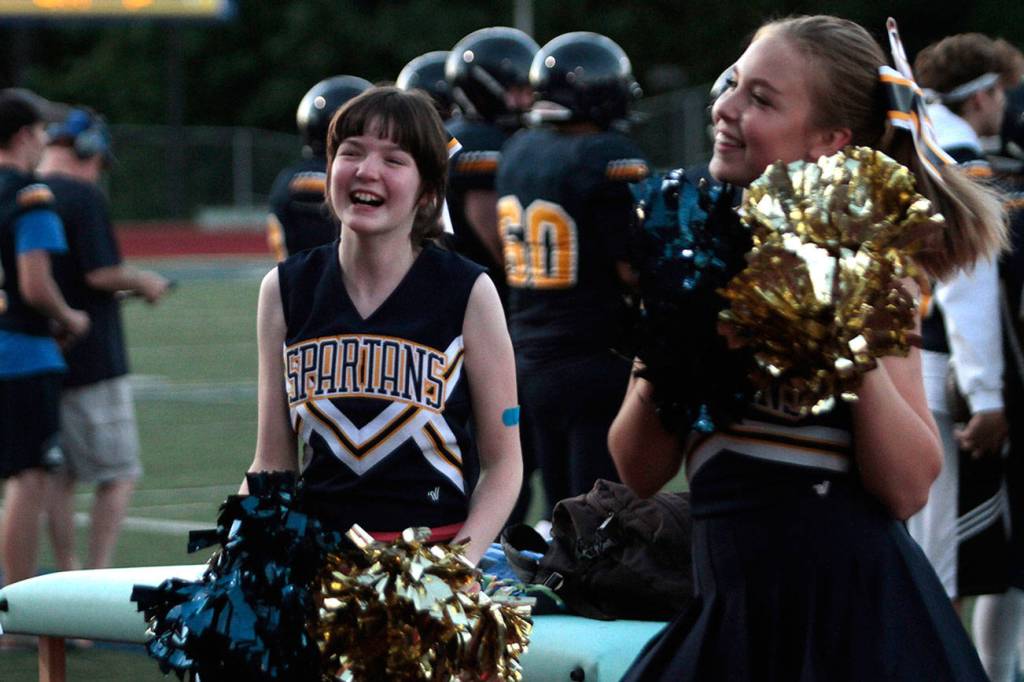 Joining the island cheerleaders in their latest joyful noise are the members of the Spirit Squad, Bainbridge’s chapter of the Sparkle Effect, a national nonprofit organization that helps cheer squads create middle school, high school and college cheer and dance teams include students with disabilities who otherwise might not get the chance to cheer.