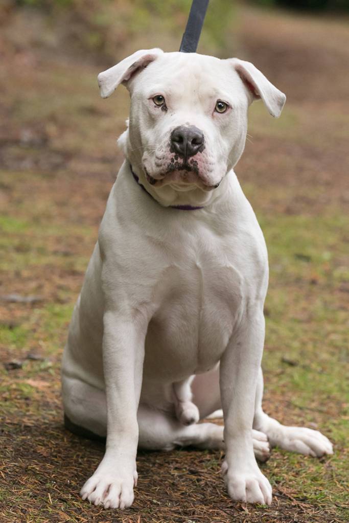 Piglet is very sweet and goofy. He enjoys running around outside and playing fetch, and snuggling up on the couch afterward. Don’t let his tough appearance fool you, this handsome man is so gentle. Piglet will lean his body into you for snuggles and petting. He is a fan of scratches right in front of his tail, and with enough scratches, his tail will wag like crazy! Piglet appears to be deaf, so he is looking for a patient and dedicated owner who will work with him on learning hand signals. Because he can’t hear you call him, he needs to be kept on leash at all times.