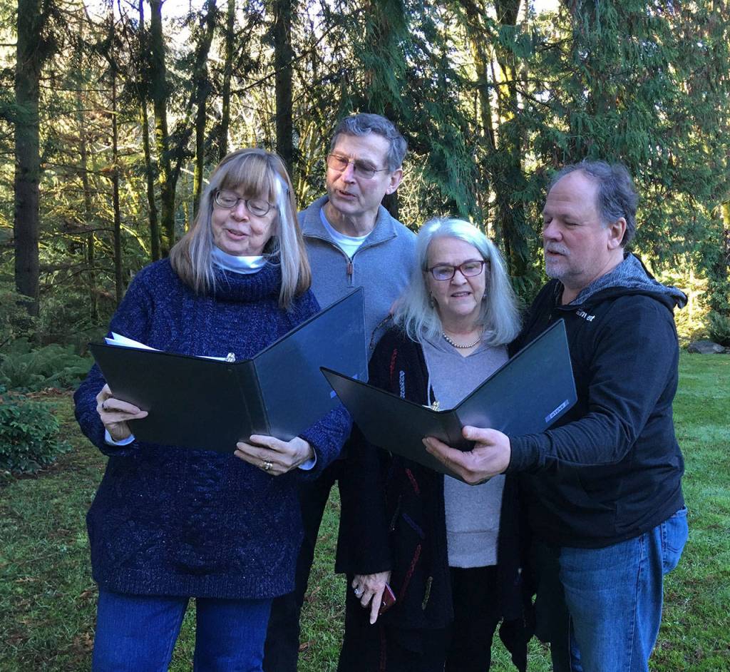 Diane Walker, Tell Schreiber, Diane Bankart and Steve Stolee rehearse for “In the Spirit.” (Photo courtesy of Island Theatre)