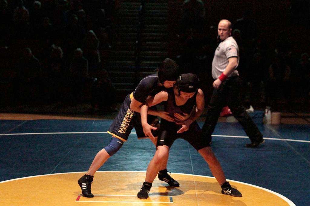 Rachel Longridge, the sole Spartan female on the Bainbridge team, likewise scored a quick win in the 120-pound bracket, pinning Garfield’s Nhu-Phung Tran in 1:03.