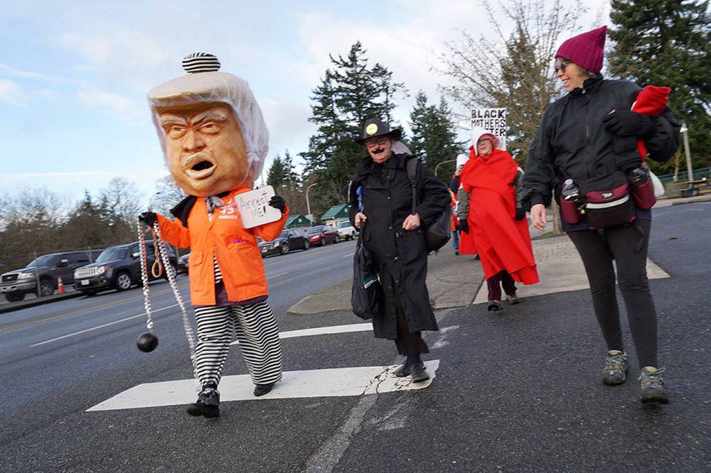 Demonstrators walk through downtown Winslow Saturday morning on their way to the ferry terminal to participate in the Seattle Women’s March 2.0