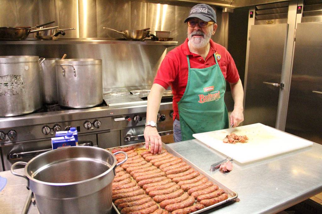 Anthon y Farrell cuts up sausage for the meat sauce early Saturday afternoon in the kitchen at St. Cecilia Parish for the annual St. Cecilia Italian Dinner.