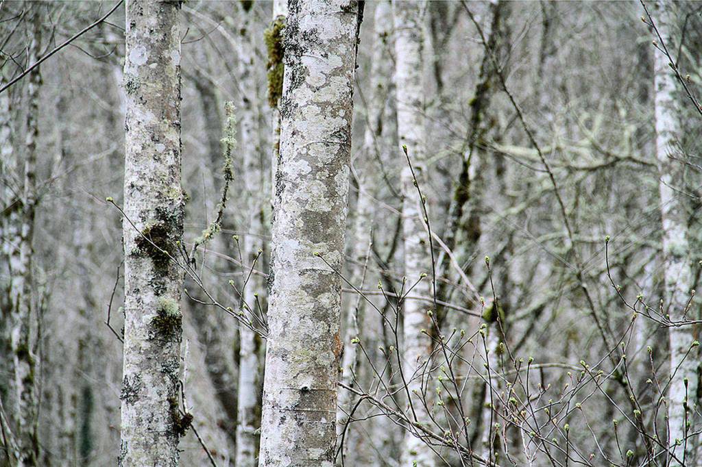 Budding branches are lost in a forest of alders during a sometimes sunny but otherwise cloudy and cold Sunday at Meigs Park.