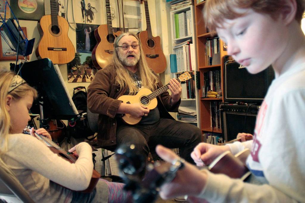 Randy Parris leads a group of aspiring ukulele virtuosos during an Island Music Guild class Monday at Rolling Bay Hall.