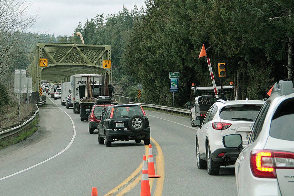Traffic on Highway 305 is slimmed down to one lane at the Agate Pass Bridge Thursday as state maintenance crews clean the bridge.