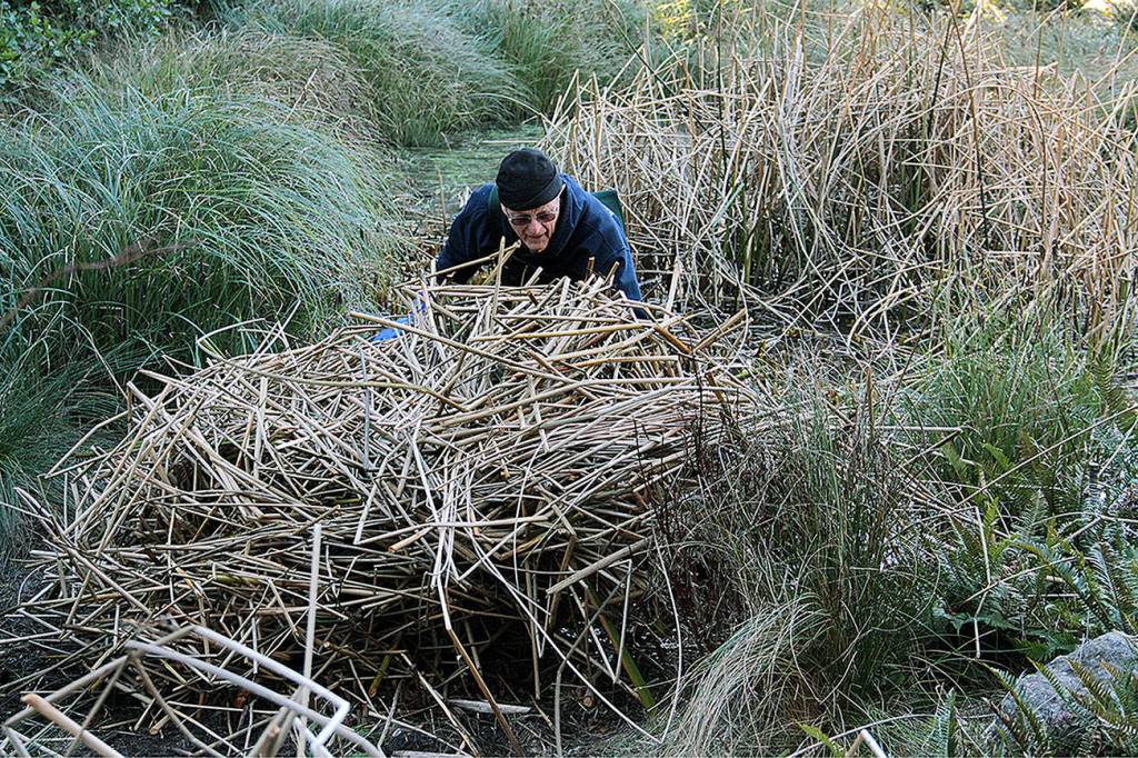 Fred Grimm pushes a pile of just-cut rush stems out of the pond at the Bainbridge Island Japanese American Exclusion Memorial on Monday afternoon.