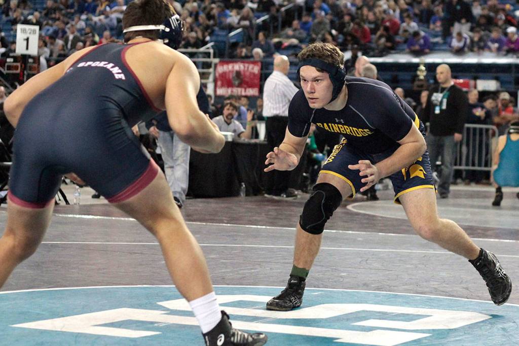 TACOMA – Despite the late hour inclusion of a previously alternate contender — 195-pounder Mac Schelbert — on the official bracket, the Bainbridge High School varsity wrestling team’s talented trio of grapplers suffered through a disappointing display at last week’s 2018 3A Washington State Mat Classic XXX Championships.
