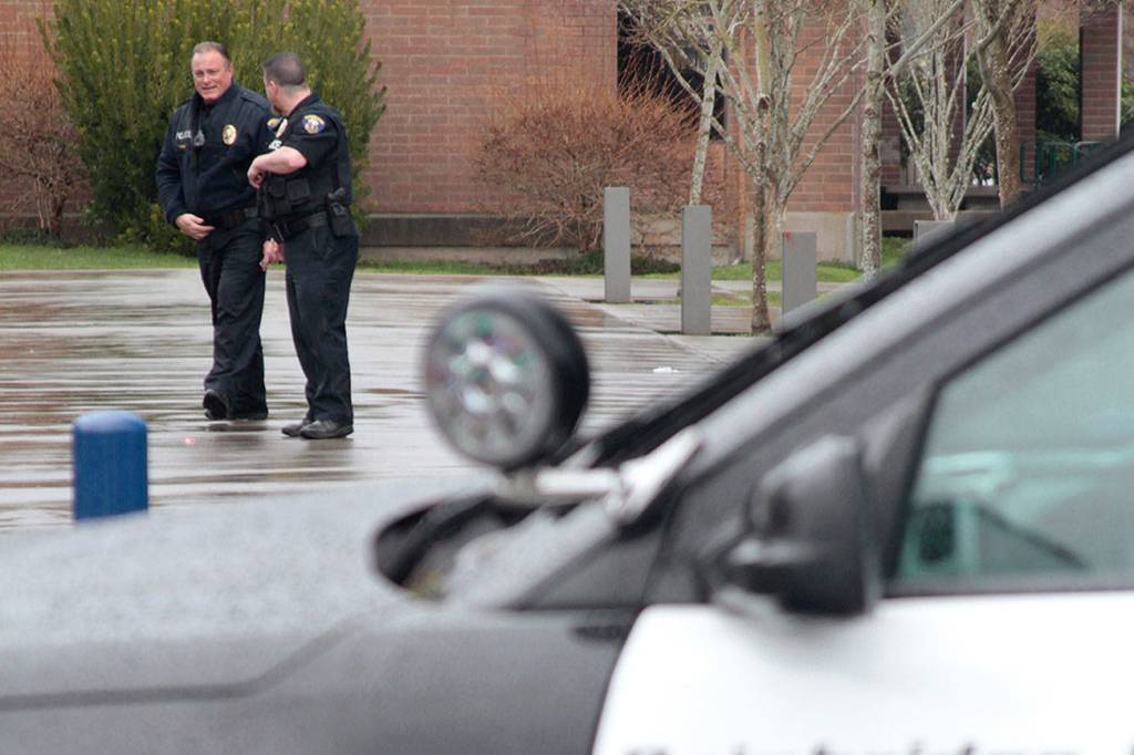 Police gather outside Bainbridge High School in the wake of a campus lockdown being called Wednesday afternoon.