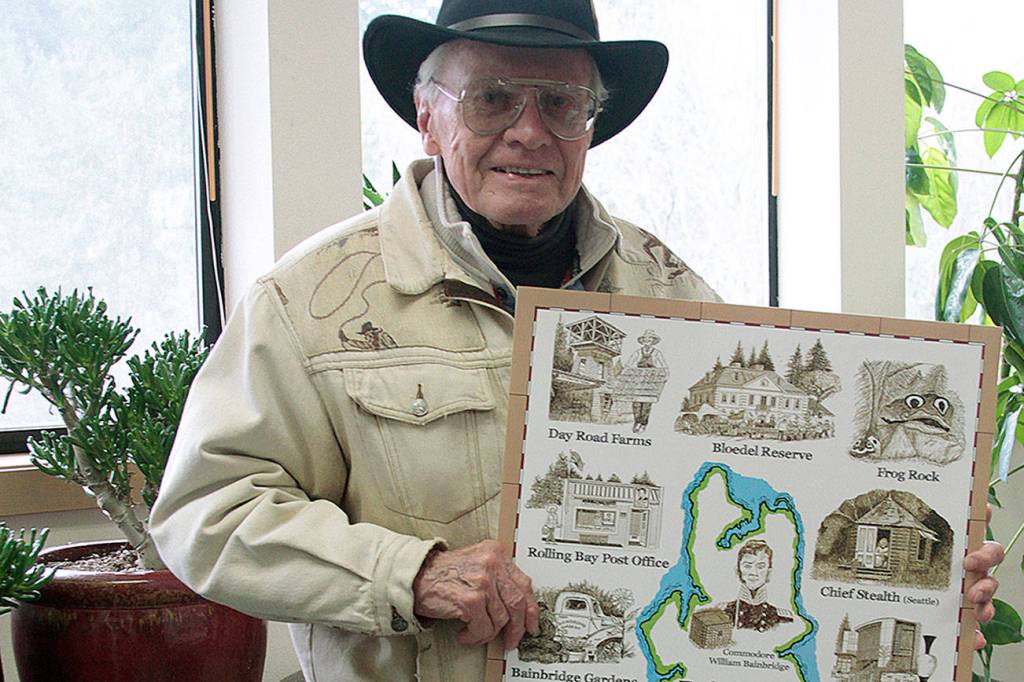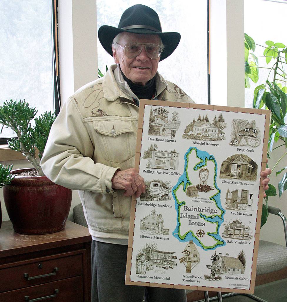 Artist Bill Hemp displays his new poster of sketches that illustrate a map of Bainbridge Island. (Luciano Marano | Bainbridge Island Review)