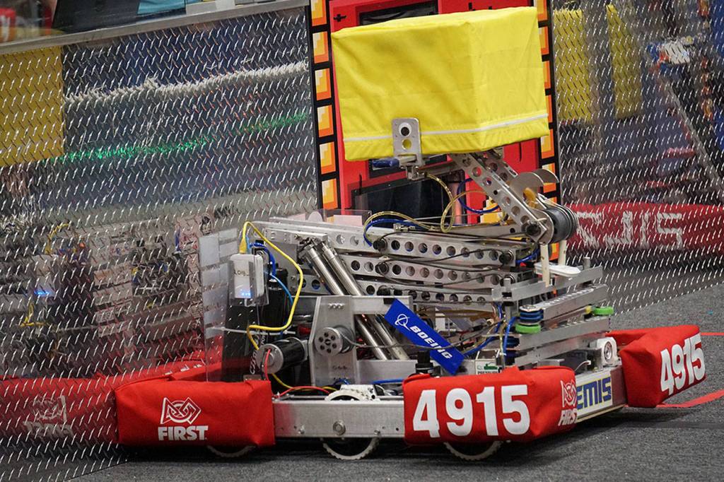 “Its scissor-lift design proved to be both an unique and extremely reliable solution to this year’s game challenge,” he said, also complimenting the student drive team, which includes Jon Coonan, Will Hobbs, James Sovick, Rose Bandrowski and Kenneth Wiersma.