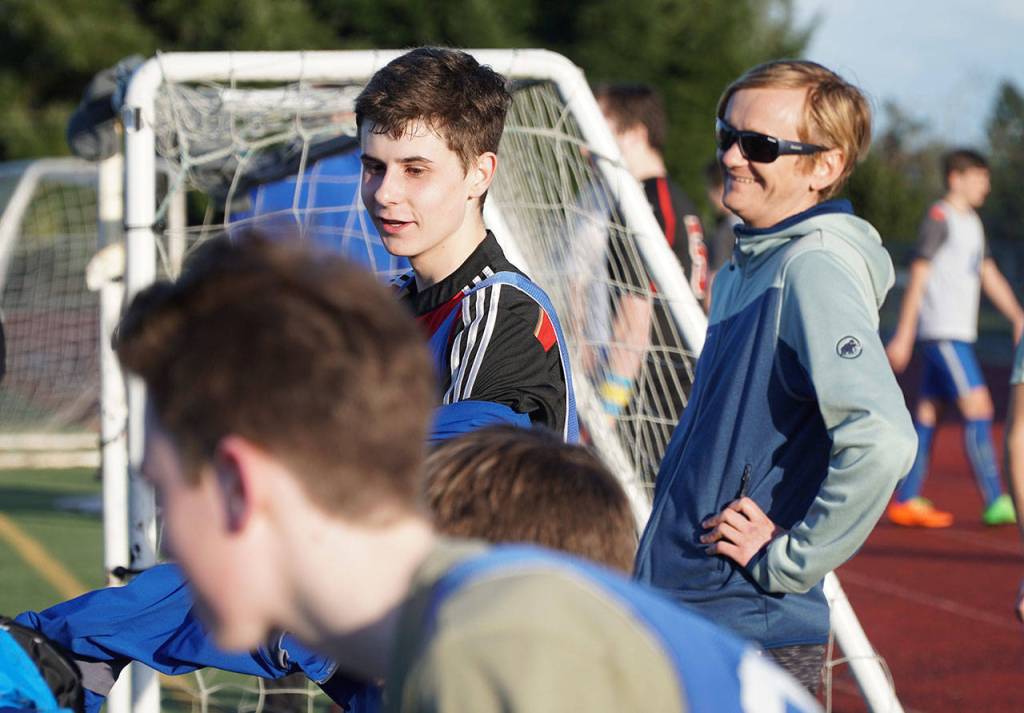 Luciano Marano | Bainbridge Island Review - Spartan varsity boys soccer team Head Coach Drew Keller laughs on the sidelines of a recent practice session.
