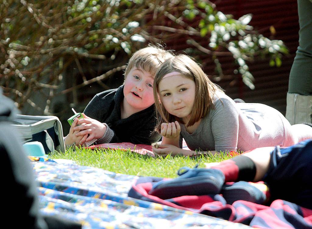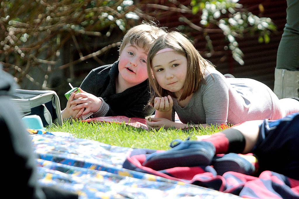 For Wednesday’s picnic, the weather cooperated and blankets were set out on the lawn next to the school for some food, fun and banjo tunes from Mike Derzon, the school’s music teacher.