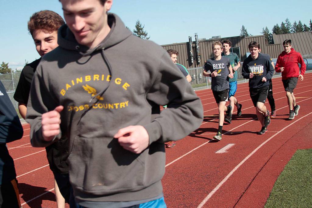 The 4×400-meter relay team of Cole Brundige, Carlo Ruggiero, Carter Hall and Wyatt Longley returned to the Rock with the 3A event title, setting a new Bainbridge High School record (3:20.47).