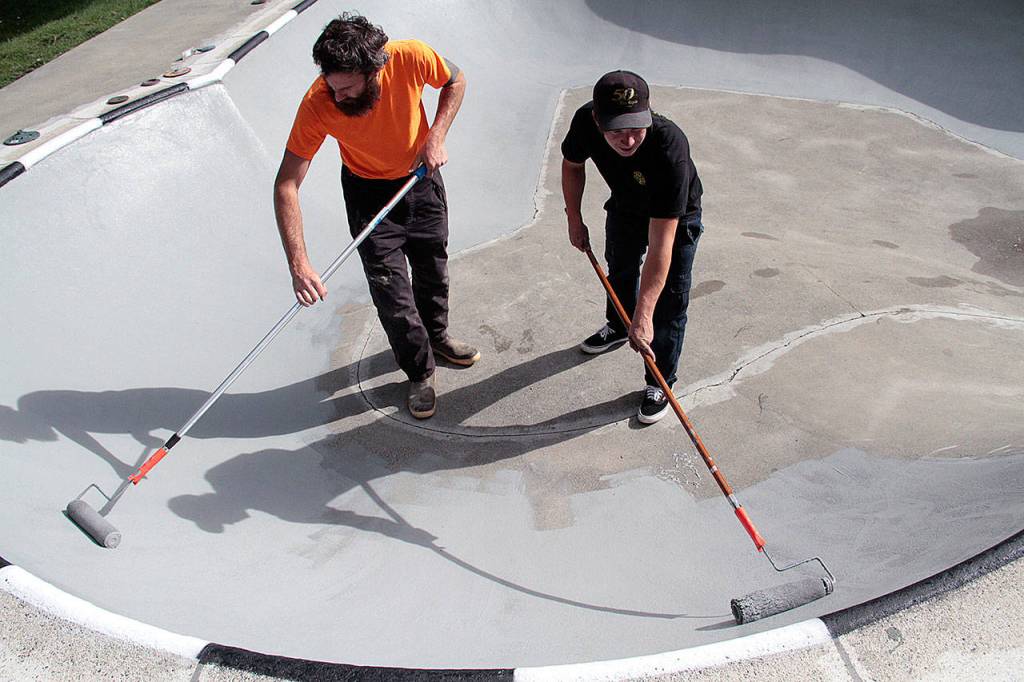 The Seattle-based company built the skatepark at Strawberry Hill Park in 2001, and employees from Grindline were busy this week restoring the popular concrete attraction to its former beauty.