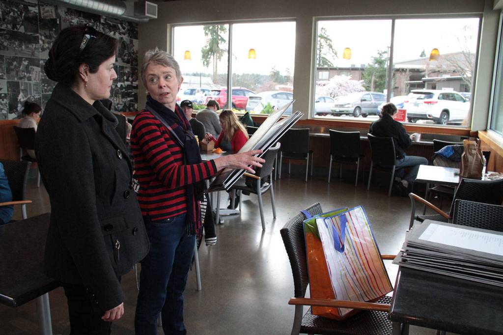 LT Yoson and Kathleen Thorne talk about where to hang selected student entries for this year’s Poetry Corners while standing in the dining area at Town & Country Market on Winslow Way Monday.