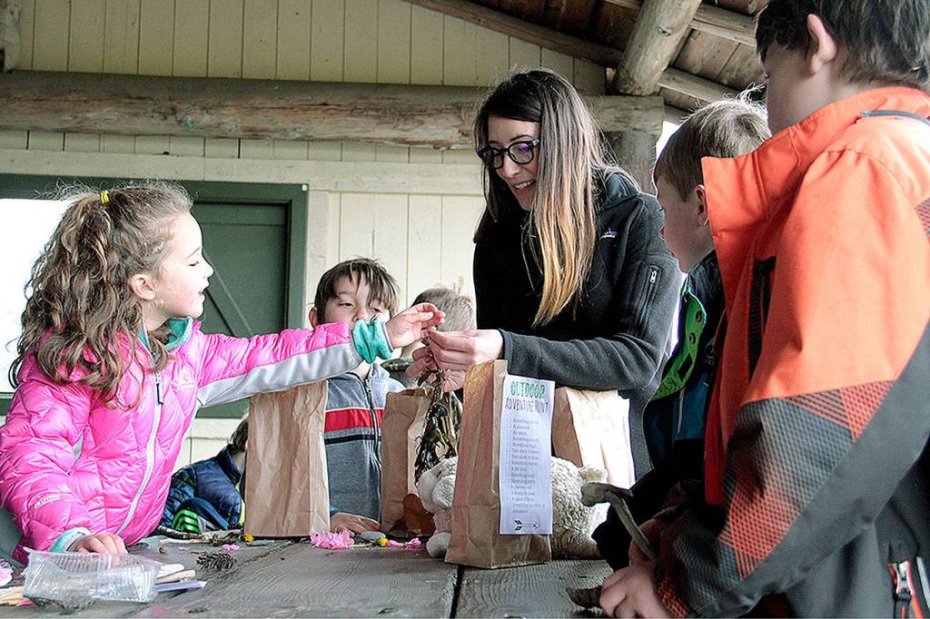 Kids in the All-Day Explorer Camp gather in the picnic shelter at Fay Bainbridge Park to show Ashley Miller (center) of the Bainbridge Island Metropolitan Park & Recreation District what they found during their outdoor adventure scavenger hunt.