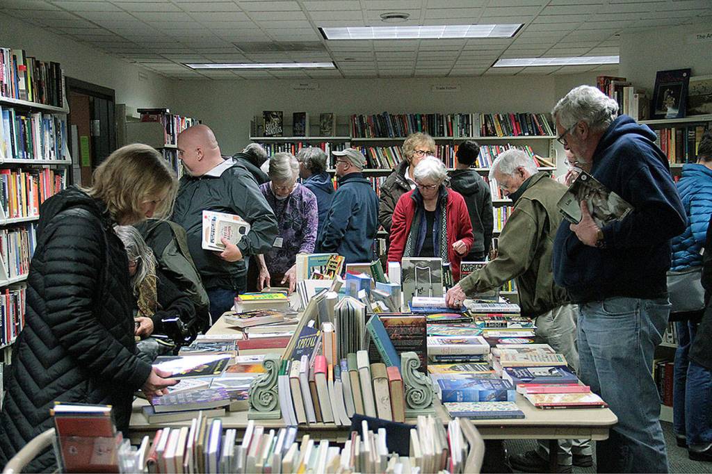 Book lovers and bargain shoppers crowd around the tables at Thursday’s book sale at the Bainbridge Public Library.
