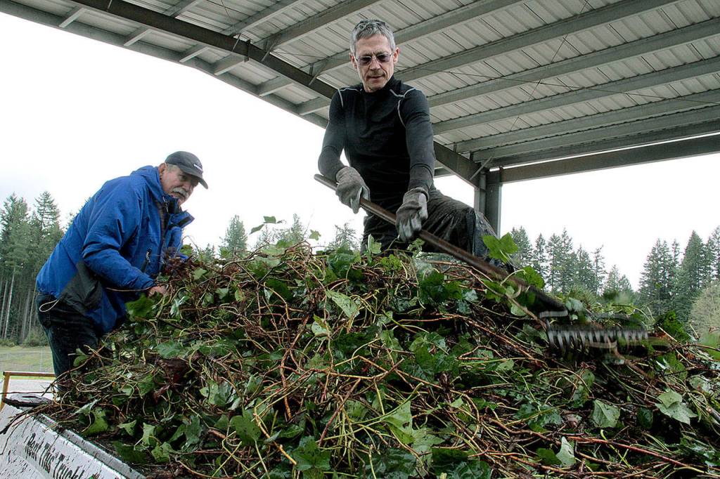 Mike Nance grabs the front end of a pickup load of invasive English ivy with his rake as volunteer John Van Dem Meerendonk helps empty the load Sunday at the Vincent Road Transfer Station.