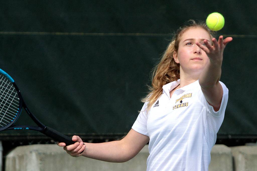 Bainbridge High’s Madison Culp serves the ball in girls singles action during the Spartans’ home meet against Lakeside Tuesday at BHS.