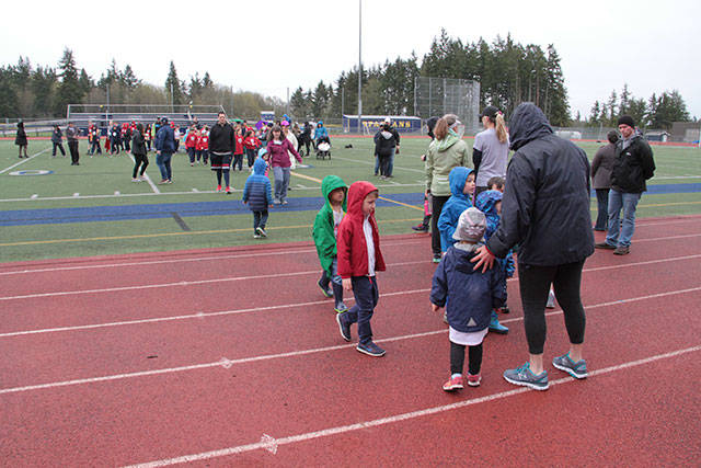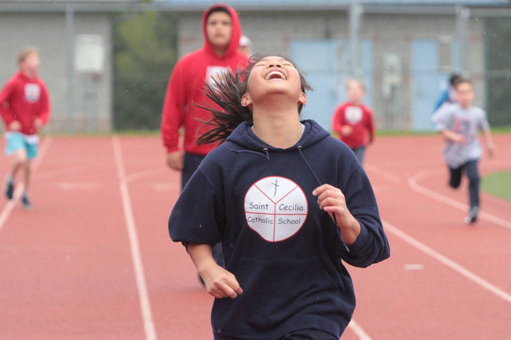 A little rain started to fall as students from St. Cecilia Catholic School hit the track at Bainbridge High’s Memorial Stadium for the school’s third annual jog-a-thon.