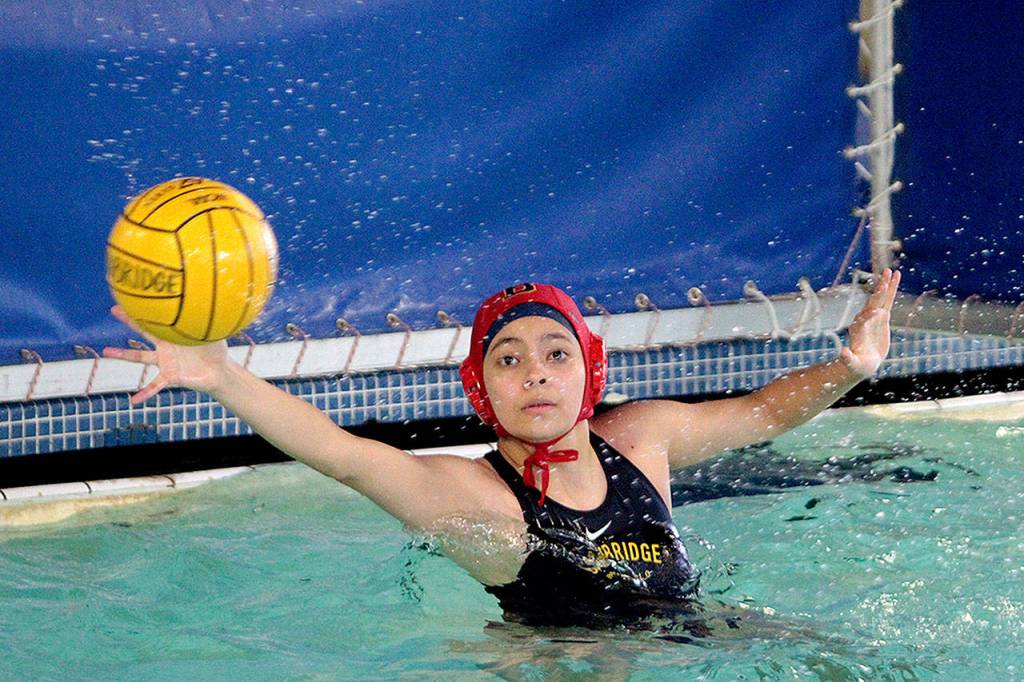 Spartan goalkeeper Taylor Jumpa blocks a shot on goal during Bainbridge’s home matchup Monday against Gig Harbor in girls varsity water polo at the Bainbridge Island Aquatic Center.
