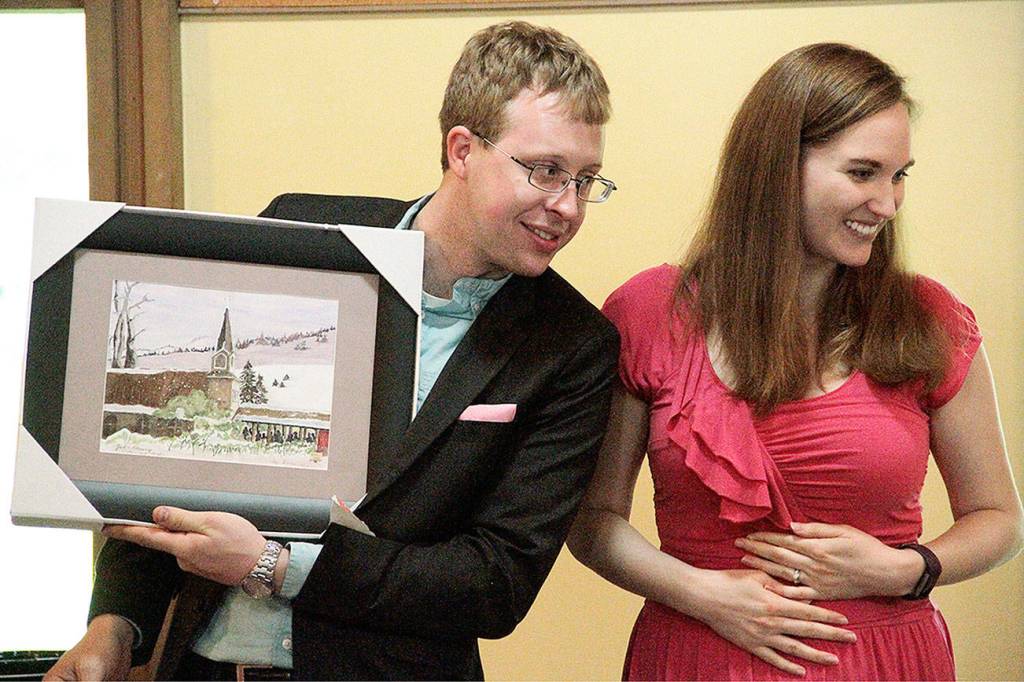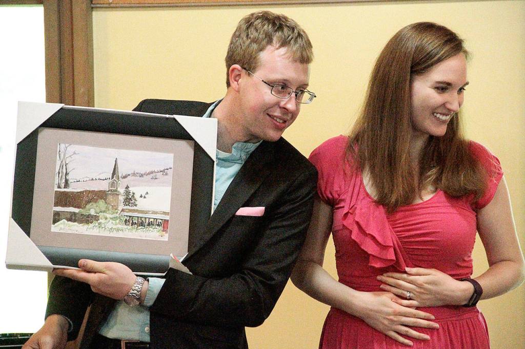 Pastor Colin Cushman and his wife Madi display a farewell gift — a painting of Seabold United Methodist Church — to the crowd gathered for the couple’s goodbye potluck at the church Sunday.