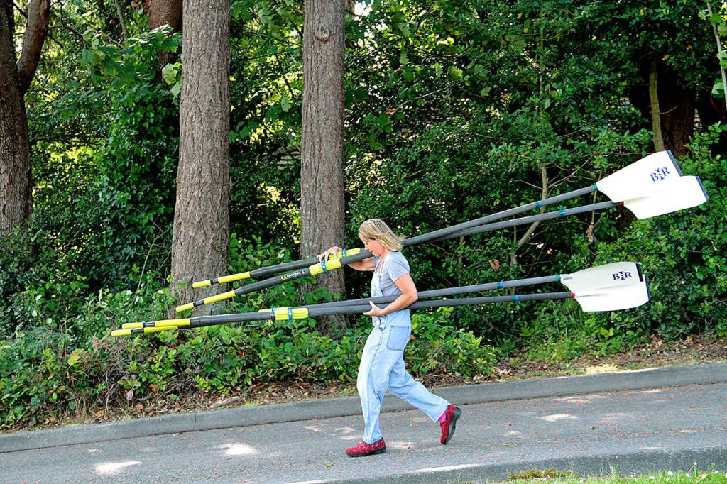 Kate Berry, a rower and men’s team coach with Bainbridge Island Rowing, carries oars down to the shore of Eagle Harbor before the start of practice late Tuesday afternoon.